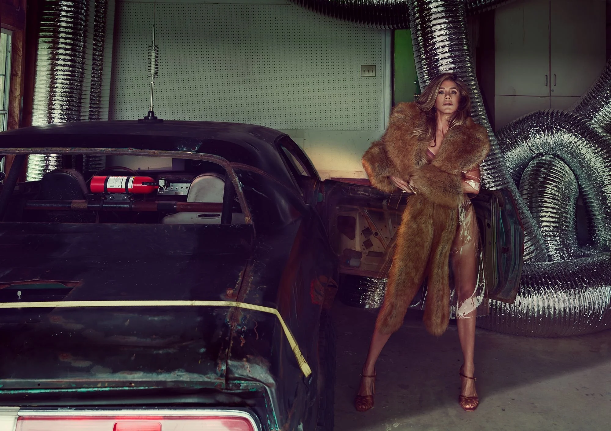 La producción continúa con un conjunto de Saint Laurent por Anthony Vaccarello, en el que la actriz aparece arrodillada sobre el pasto de un invernadero. El top de encaje verde musgo y la falda tubo a juego, acompañados de stilettos nude acharolados de Manolo Blahnik, muestran un equilibrio entre feminidad y sofisticación clásica, complementado con un maquillaje neutro y peinado voluminoso. Por último, en un entorno campestre, Aniston viste un vestido blanco de Balenciaga con falda abierta que deja al descubierto un body con corpiño push up, uniendo el glamour de la moda con la rusticidad del paisaje a través de un rastrillo en mano.